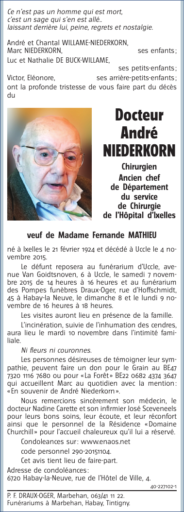 Décédé à Bruxelles (Uccle) (1180) le mardi 3 novembre 2015 à l'âge de 91 ans