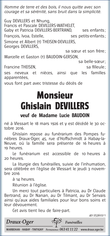 Décédé à Vlessart (6860) le dimanche 30 octobre 2016 à l'âge de 90 ans