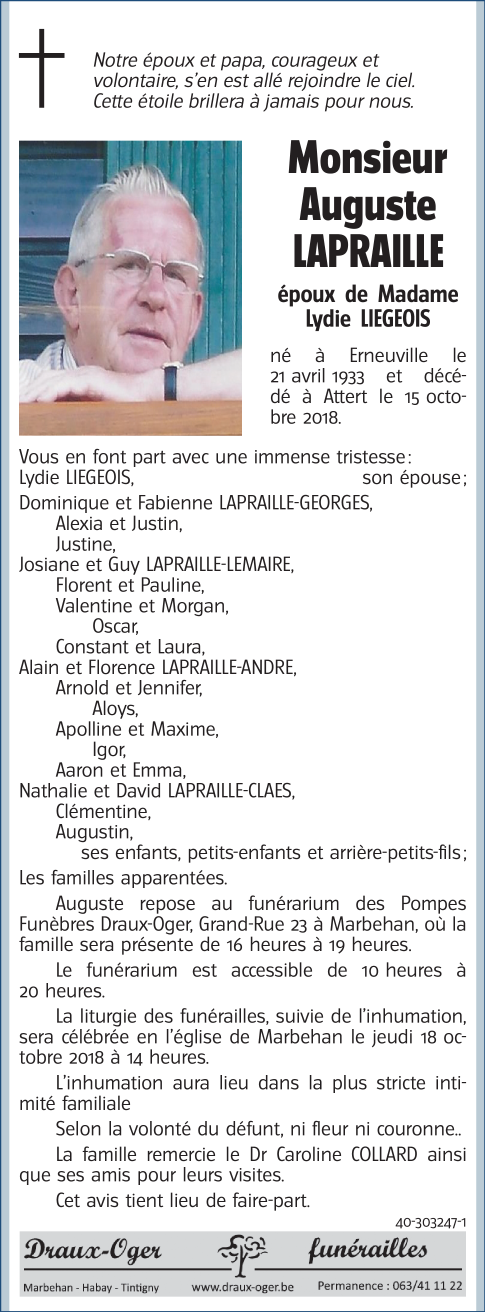 Décédé à Attert (6717) le lundi 15 octobre 2018 à l'âge de 85 ans