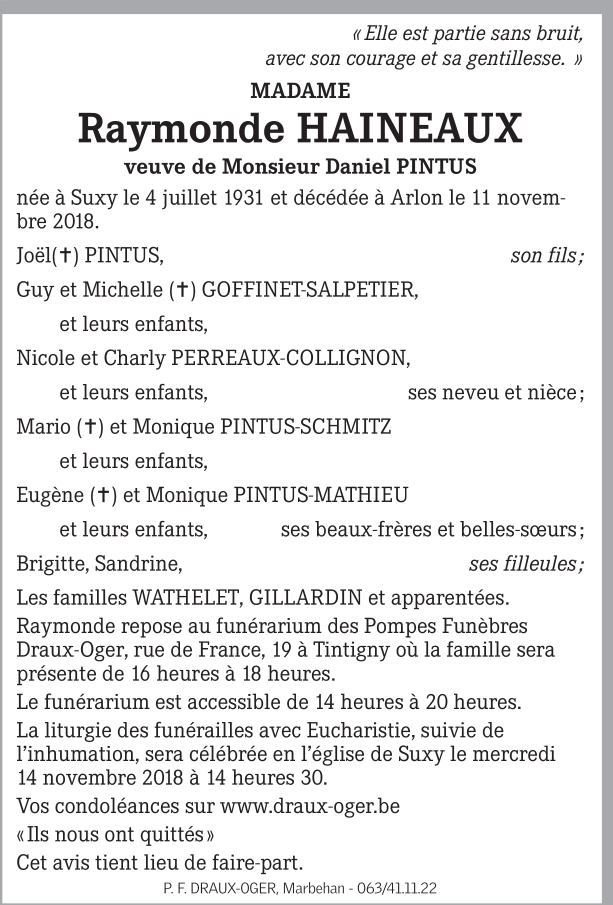 Décédée à Arlon (6700 ) le dimanche 11 novembre 2018 à l'âge de 87 ans