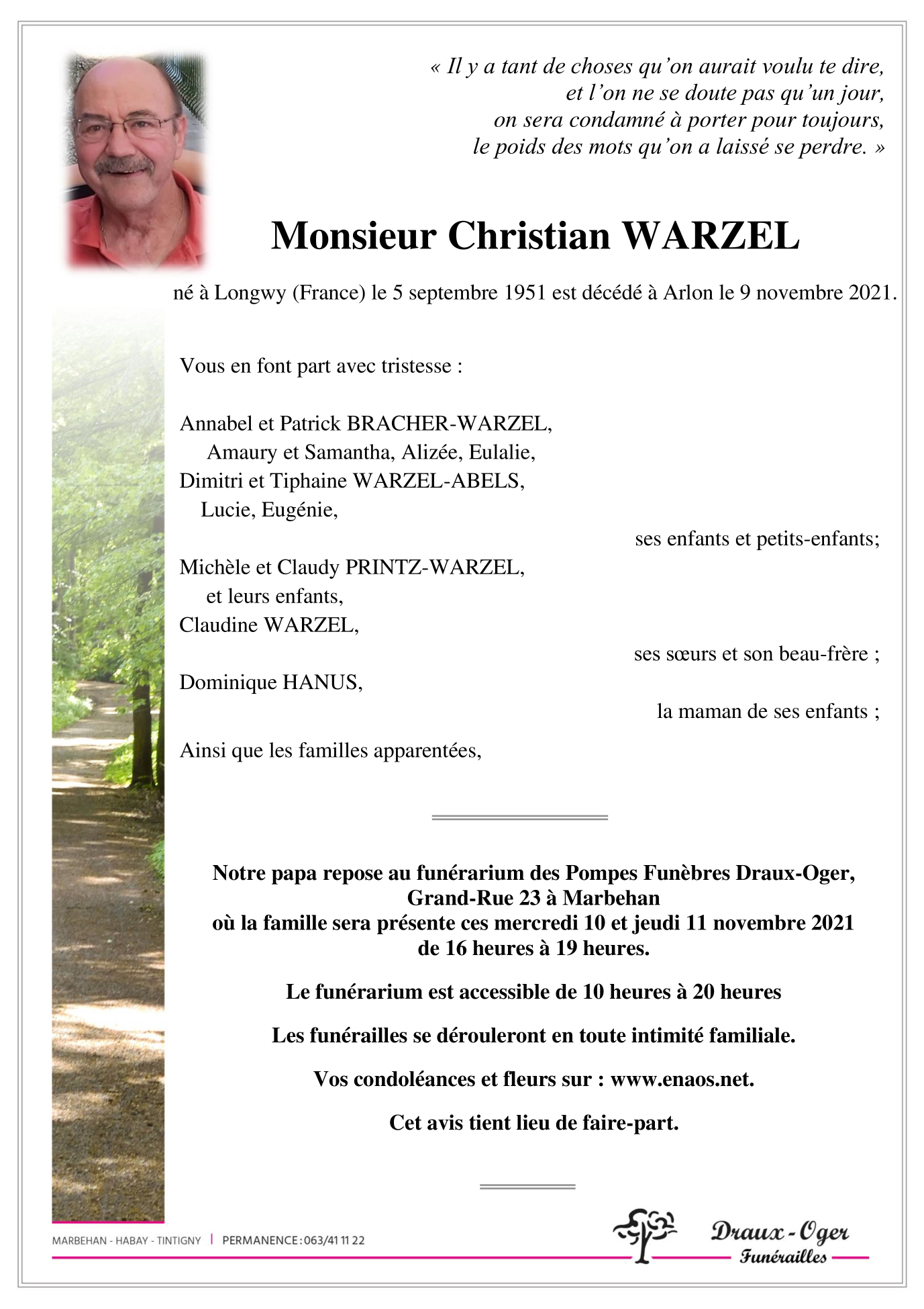 Décédé à Arlon (6700) le mardi 9 novembre 2021 à l'âge de 70 ans