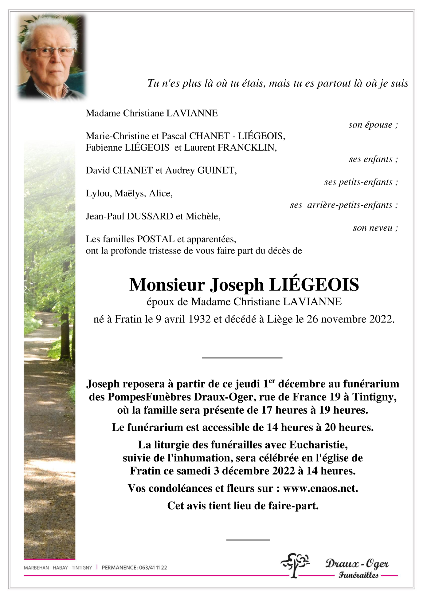 Décédé à Liège (4000) le samedi 26 novembre 2022 à l'âge de 90 ans