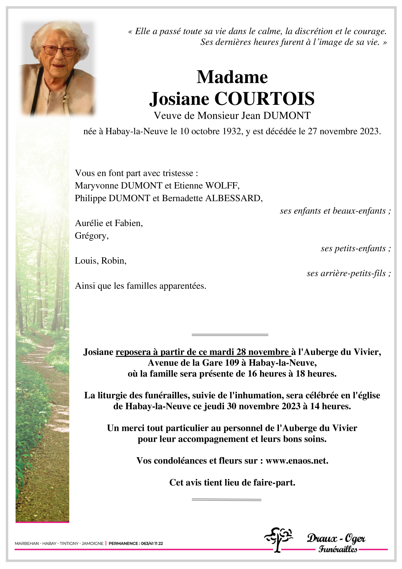 Décédée à Habay (6720) le lundi 27 novembre 2023 à l'âge de 91 ans