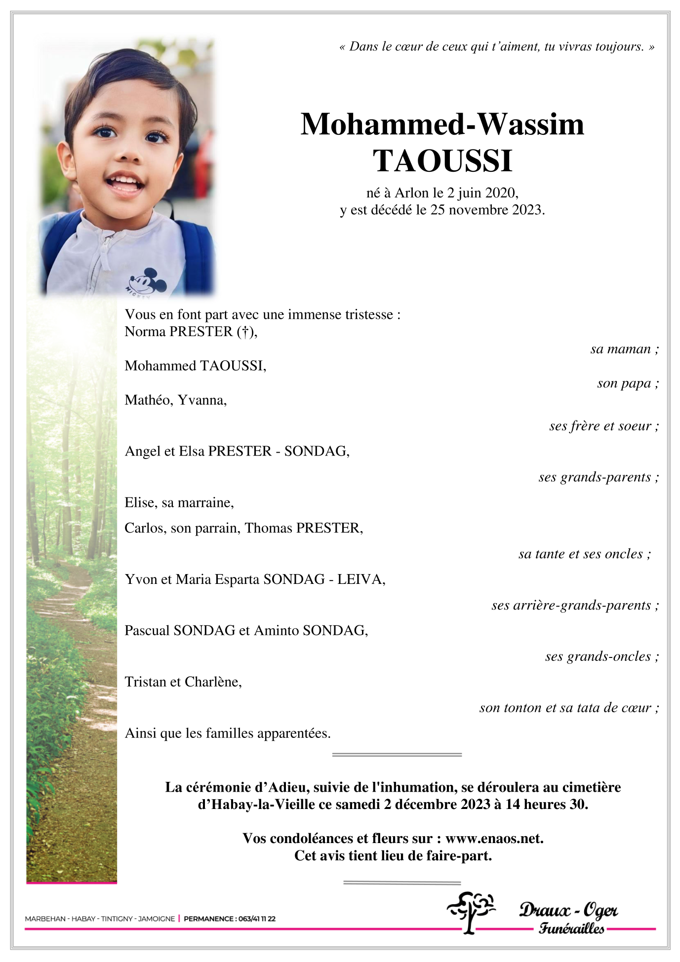 Décédé à Arlon (6700) le samedi 25 novembre 2023 à l'âge de 3 ans