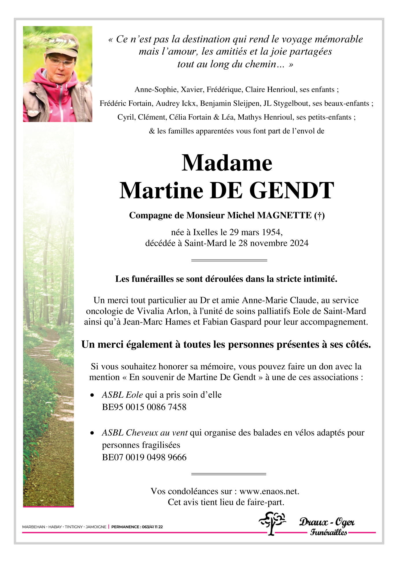 Décédée à Saint-Mard (6762) le jeudi 28 novembre 2024 à l'âge de 70 ans