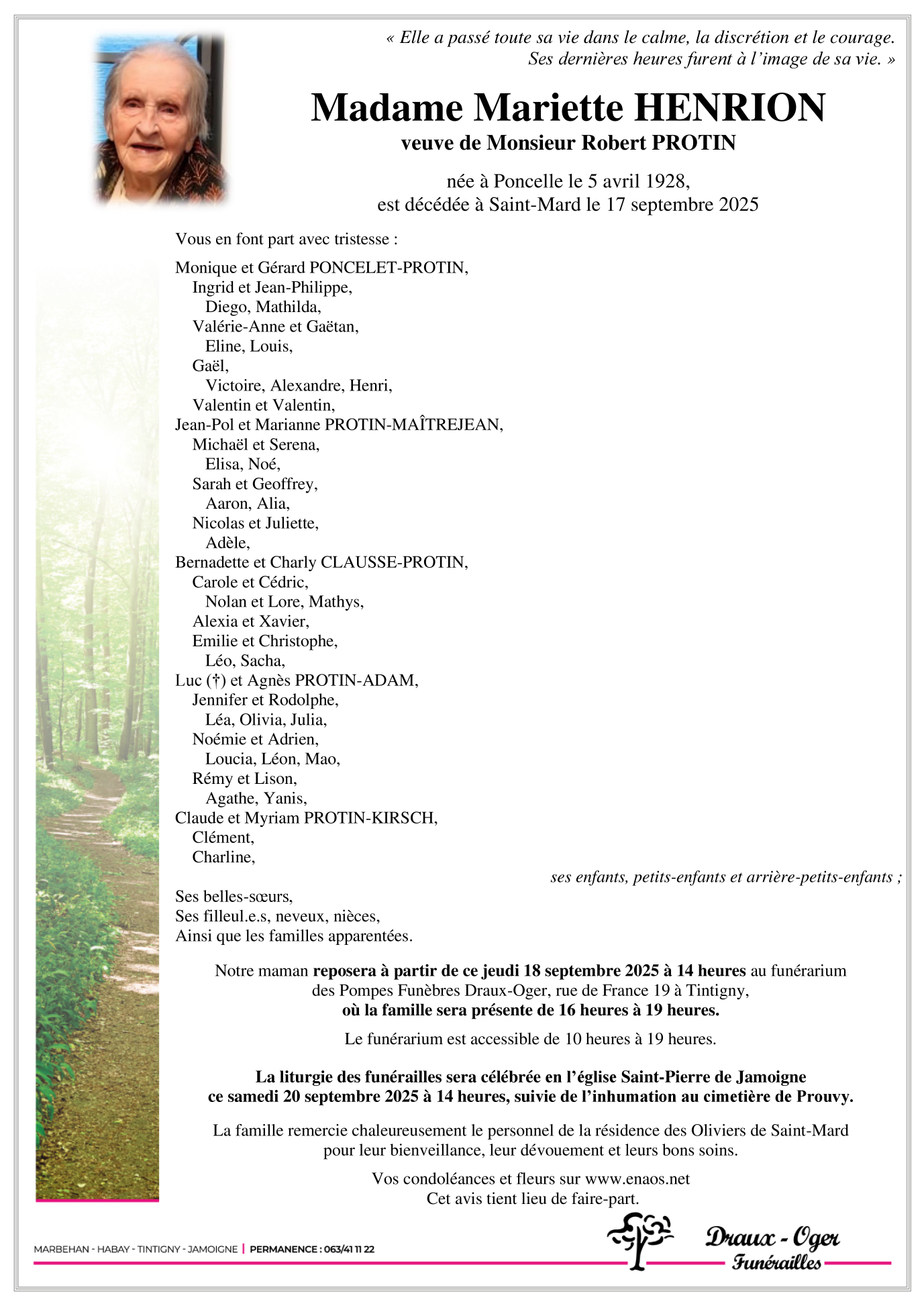 Décédée à Saint-Mard (6762) le mercredi 17 septembre 2025 à l'âge de 97 ans