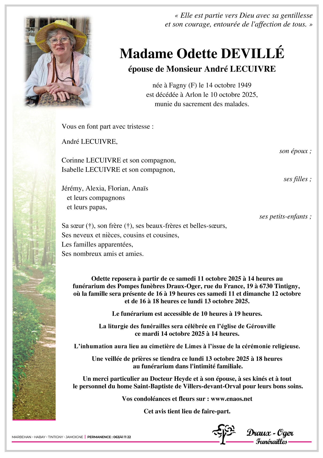 Décédée à Arlon (6700) le vendredi 10 octobre 2025 à l'âge de 75 ans