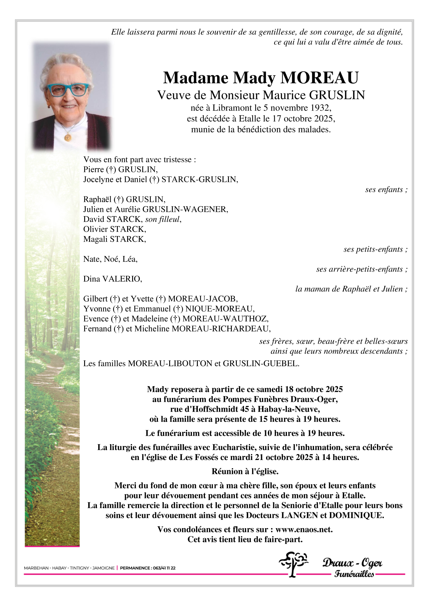 Décédée à Etalle (6740) le vendredi 17 octobre 2025 à l'âge de 92 ans