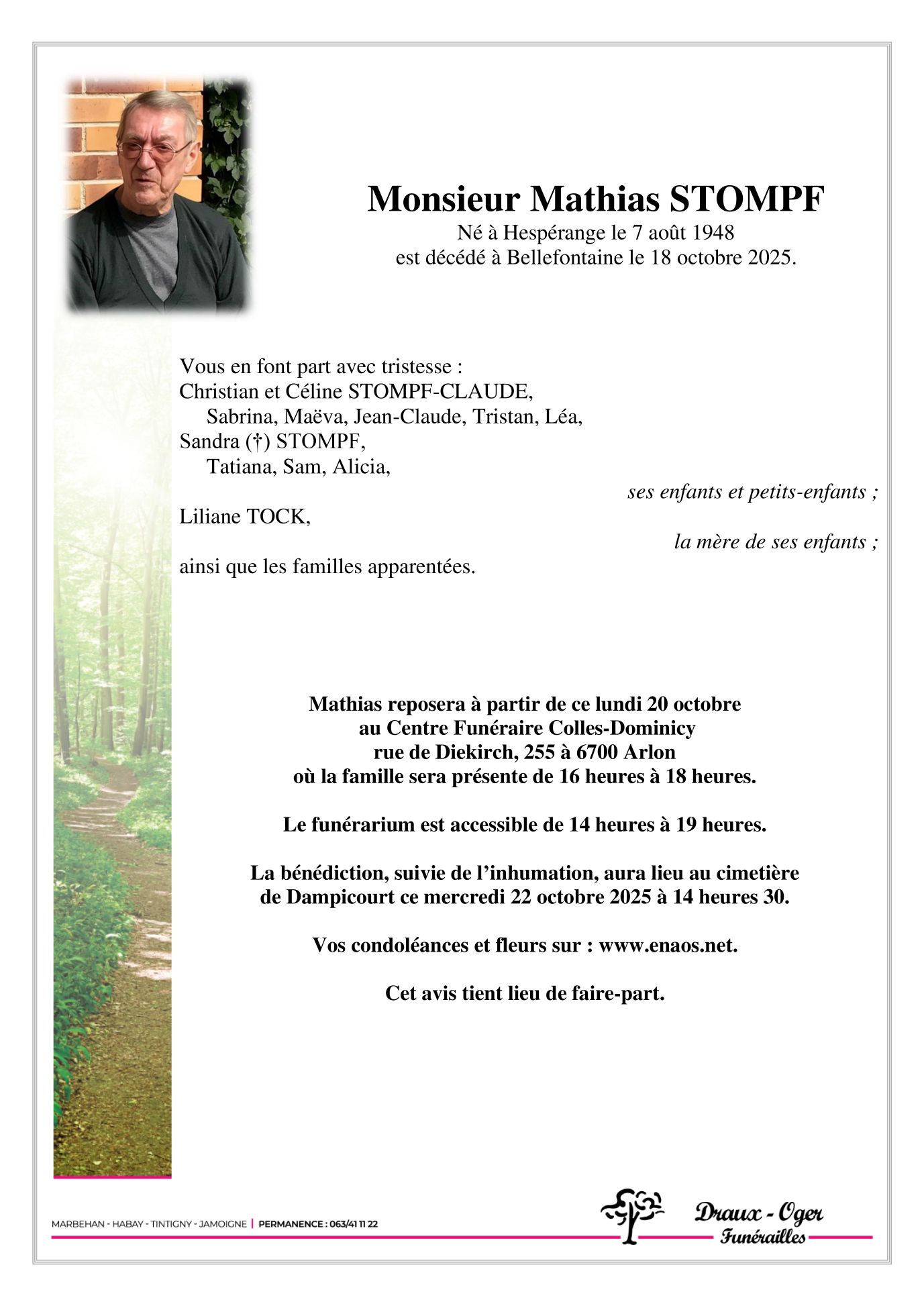 Décédé à Bellefontaine (Lux.) (6730) le samedi 18 octobre 2025 à l'âge de 77 ans