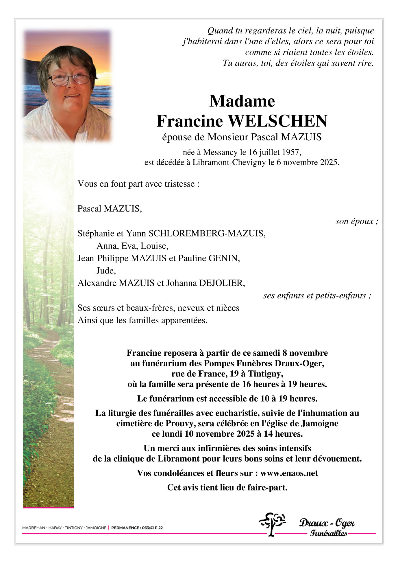 Décédée à Libramont-Chevigny (6800) le jeudi 6 novembre 2025 à l'âge de 68 ans
