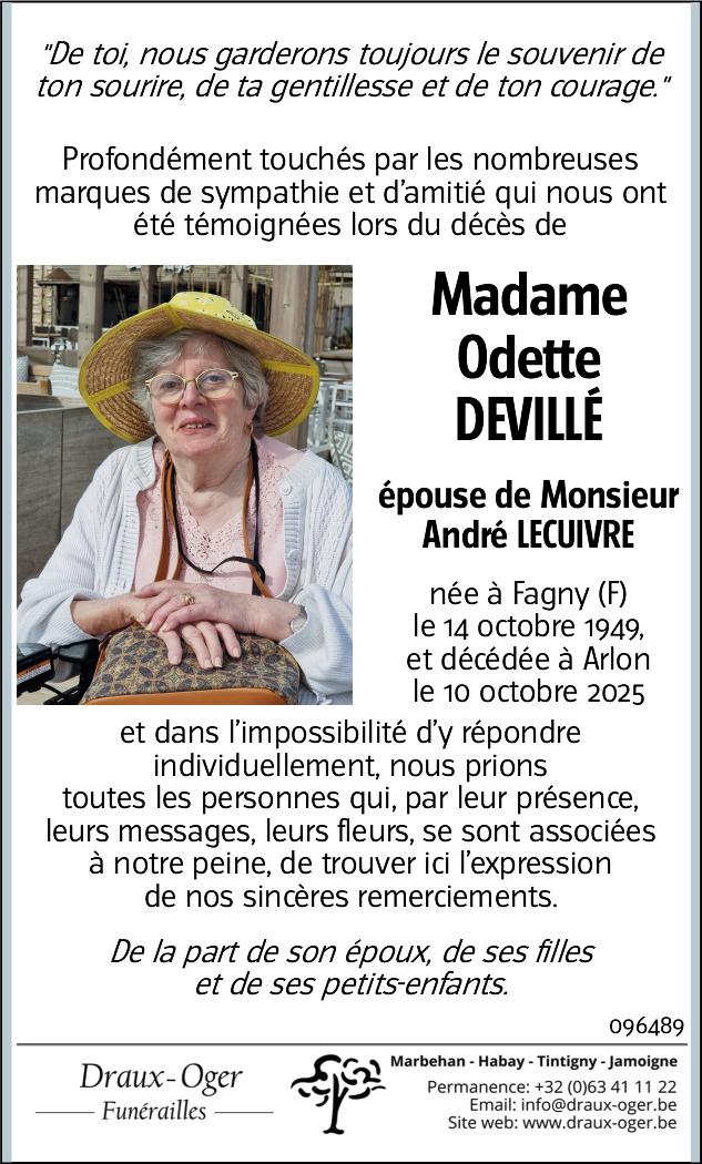 Décédée à Arlon (6700) le vendredi 10 octobre 2025 à l'âge de 75 ans