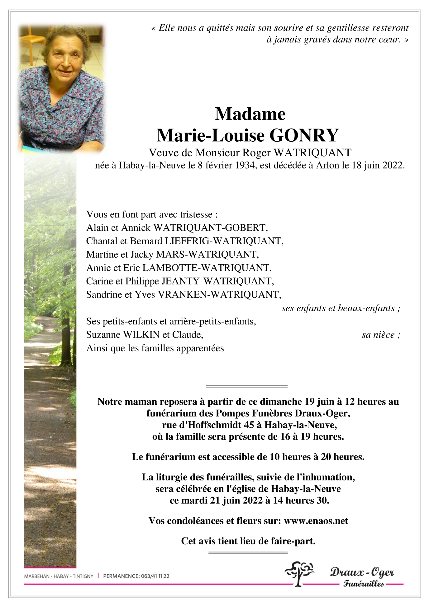Décédée à Arlon (6700) le samedi 18 juin 2022 à l'âge de 88 ans