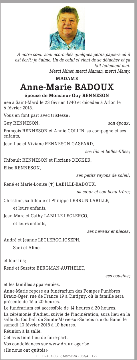 Née à Saint-Mard (6762) le vendredi 23 février 1940