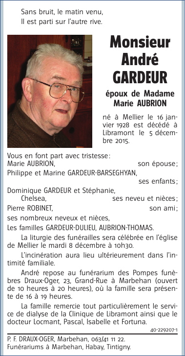 Décédé à Libramont (6800) le samedi 5 décembre 2015 à l'âge de 87 ans