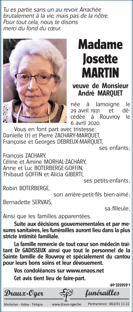 Décédée à Rouvroy (6767) le lundi 6 avril 2020 à l'âge de 88 ans