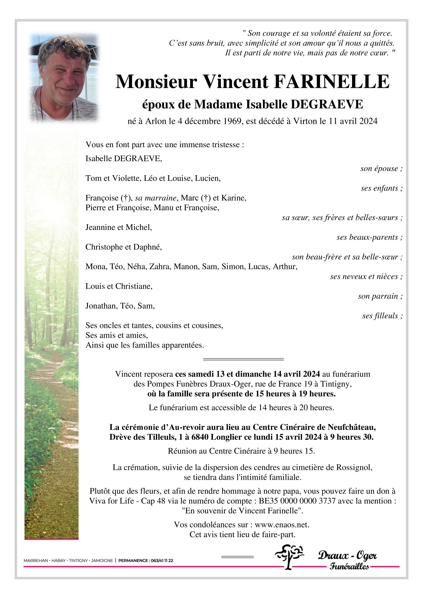 Décédé à Virton (6760) le jeudi 11 avril 2024 à l'âge de 54 ans