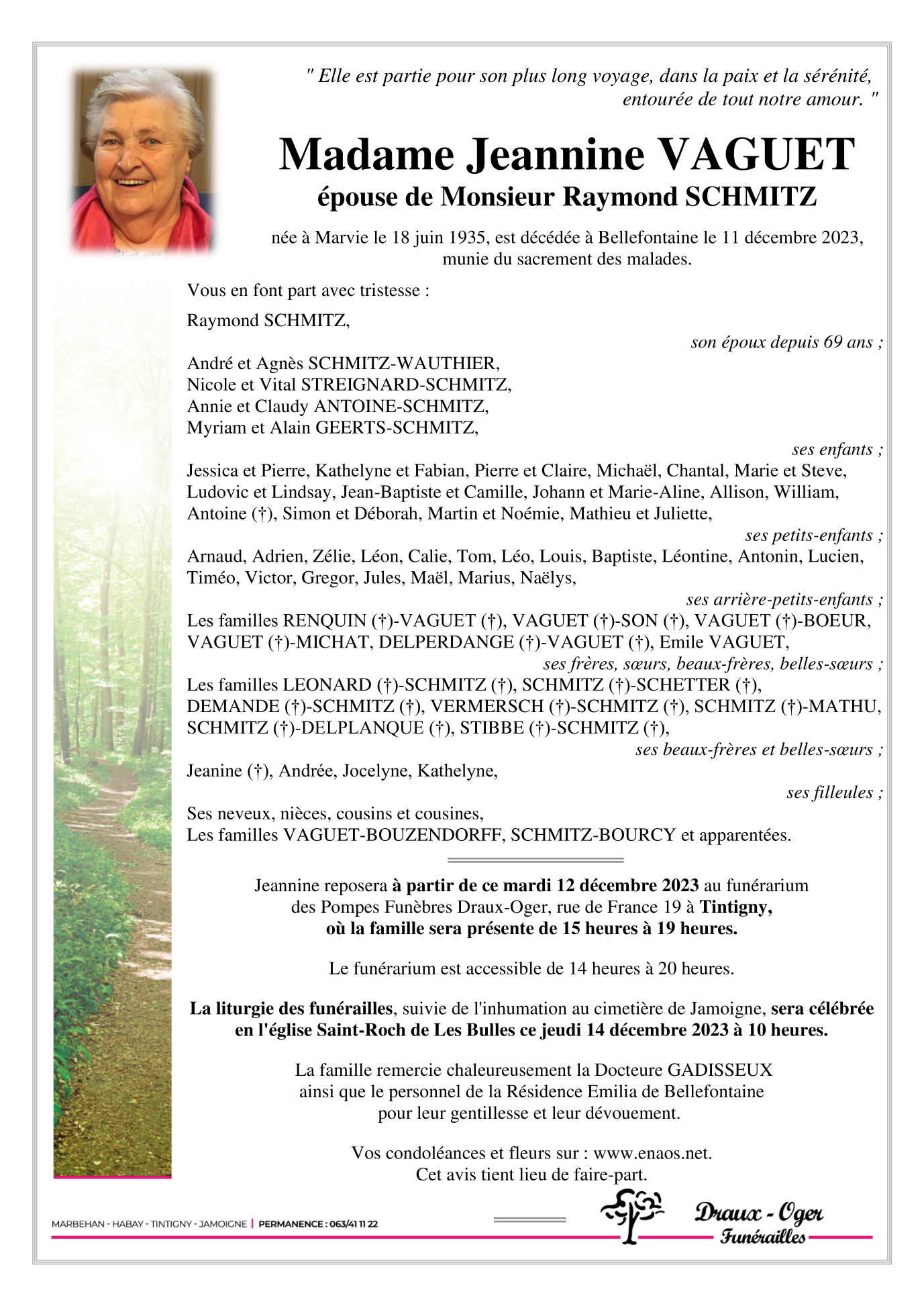 Décédée à Bellefontaine (Lux.) (6730) le lundi 11 décembre 2023 à l'âge de 88 ans