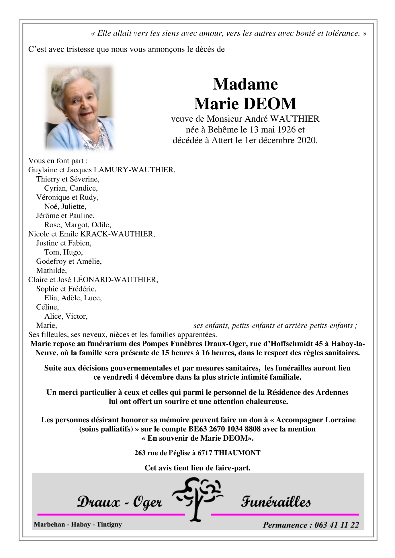 Décédée à Attert (6717) le mardi 1 décembre 2020 à l'âge de 94 ans