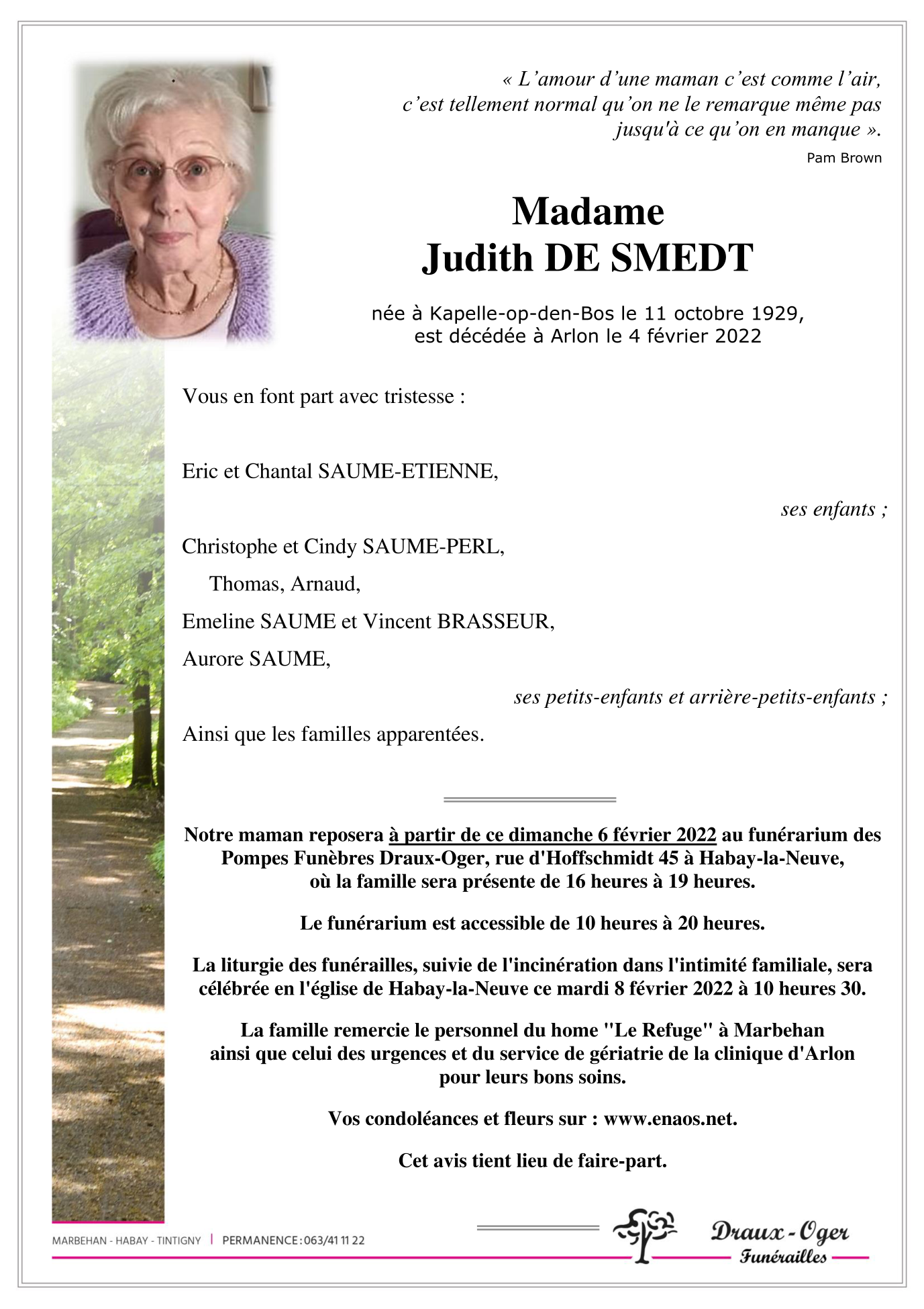 Décédée à Arlon (6700) le vendredi 4 février 2022 à l'âge de 92 ans