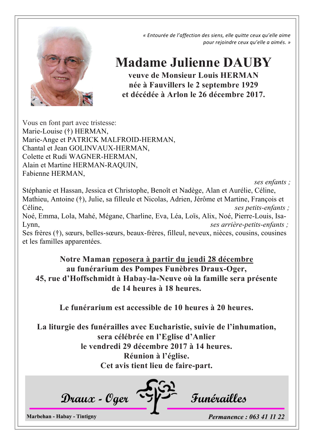 Décédée à Arlon (6700) le mardi 26 décembre 2017 à l'âge de 88 ans