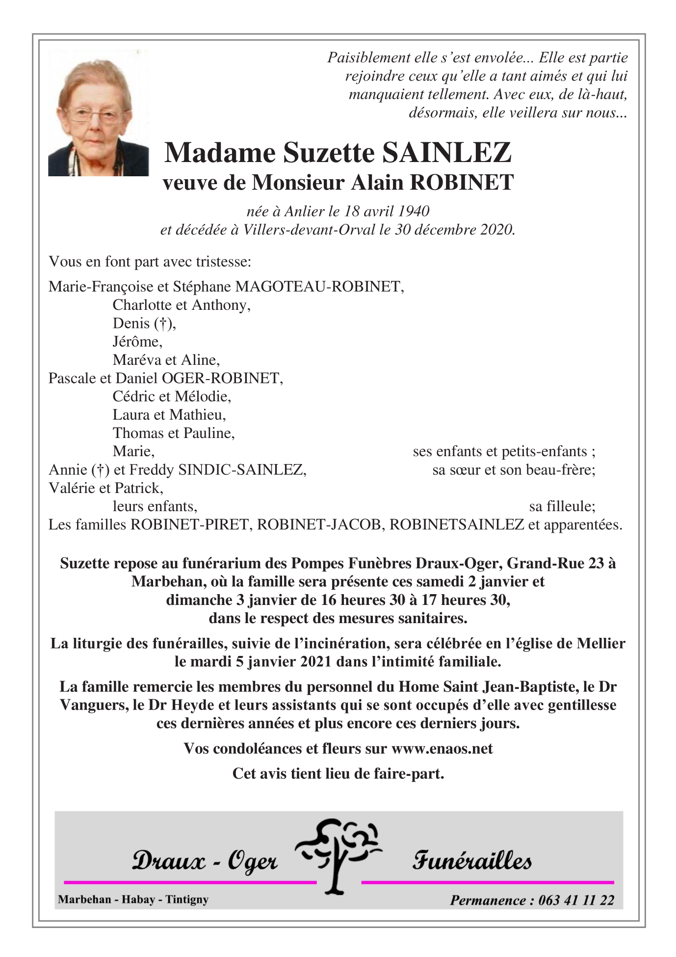 Décédée à Villers-Devant-Orval (6823) le mercredi 30 décembre 2020 à l'âge de 80 ans