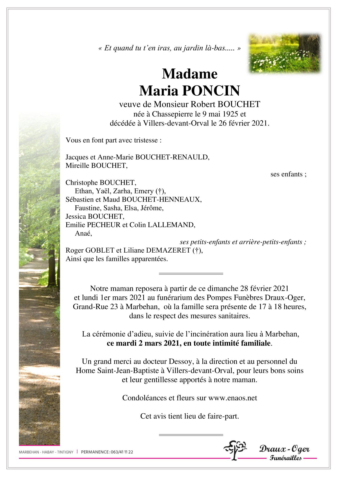 Décédée à Florenville (6820) le vendredi 26 février 2021 à l'âge de 95 ans