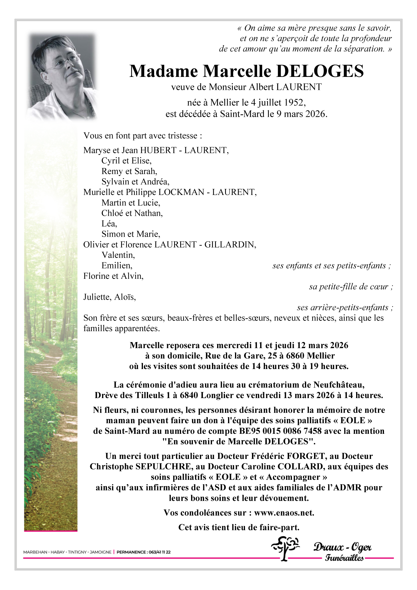 Décédée à Saint-Mard (6762) le lundi 9 mars 2026 à l'âge de 73 ans