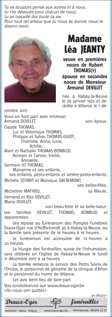 Décédée à Villance (6890) le jeudi 7 décembre 2017 à l'âge de 94 ans