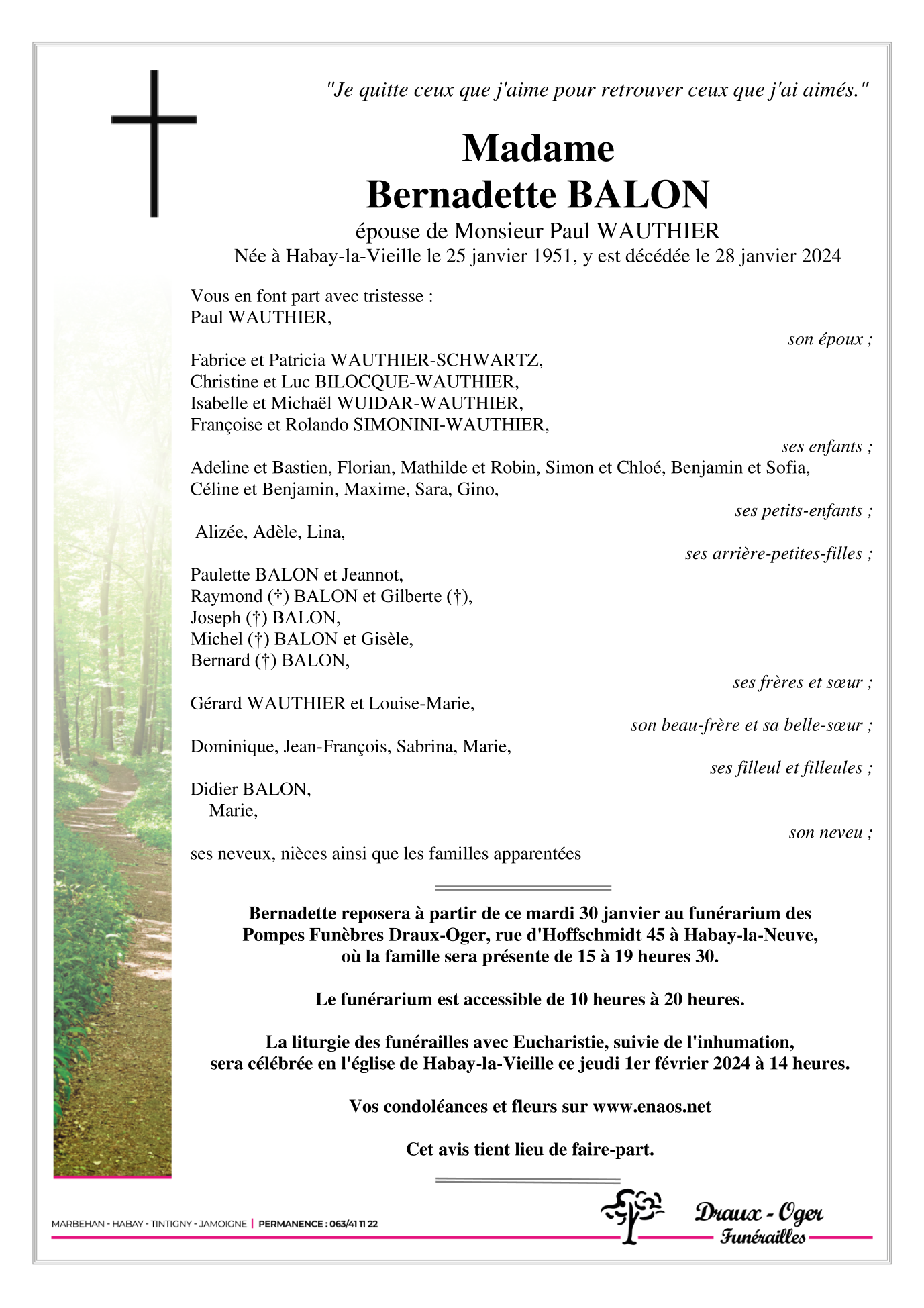 Décédée à Habay-la-Vieille (6723) le dimanche 28 janvier 2024 à l'âge de 73 ans
