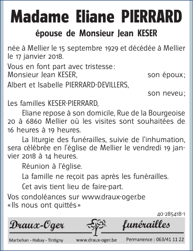 Décédée à Mellier (6860) le mercredi 17 janvier 2018 à l'âge de 88 ans