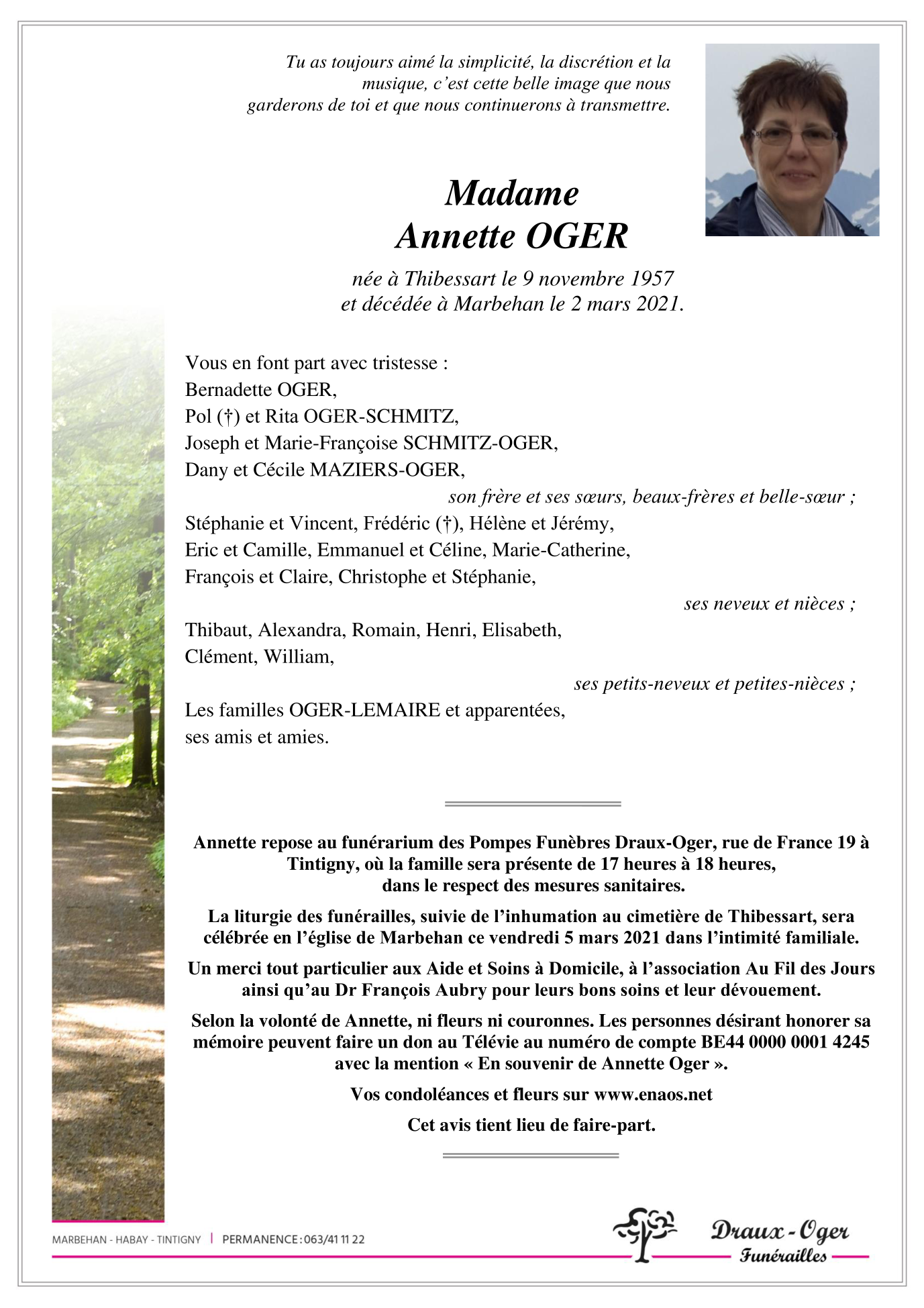 Décédée à Marbehan (6724) le mardi 2 mars 2021 à l'âge de 63 ans
