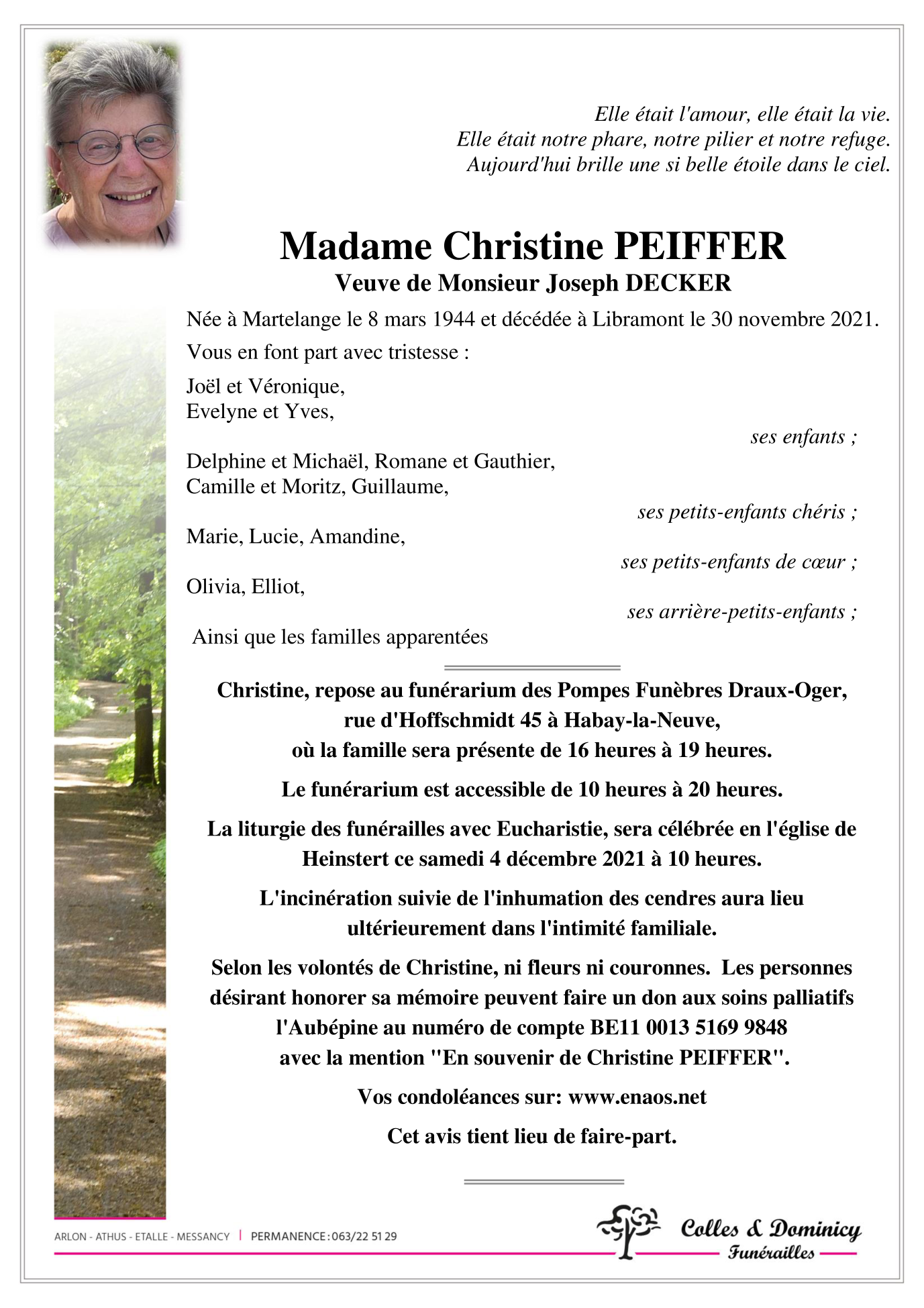 Décédée à Libramont-Chevigny (6800) le mardi 30 novembre 2021 à l'âge de 77 ans