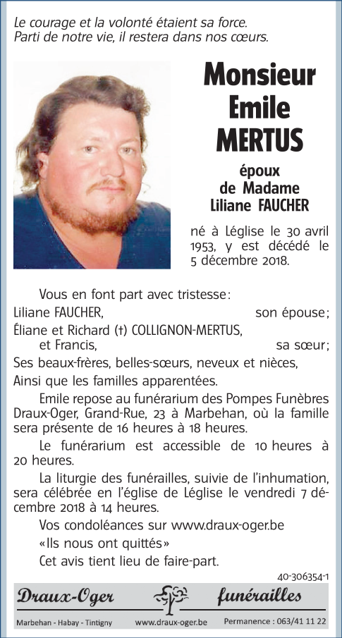 Décédé à Léglise (6860) le mercredi 5 décembre 2018 à l'âge de 65 ans