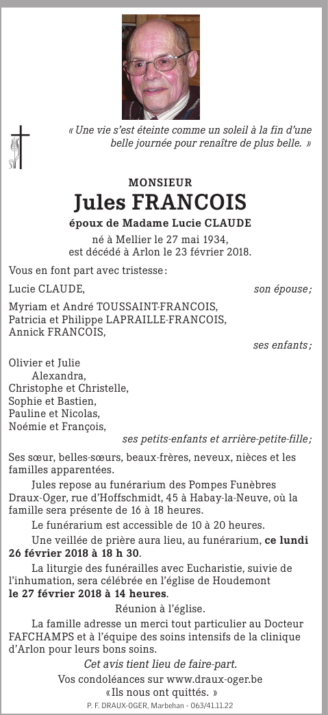 Décédé à Arlon (6700) le vendredi 23 février 2018 à l'âge de 83 ans