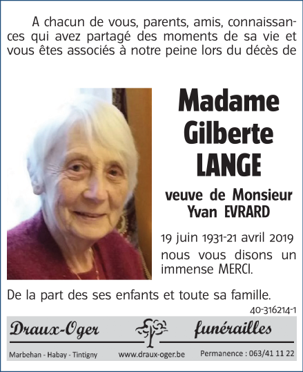 Décédée à Carlsbourg (6850) le dimanche 21 avril 2019 à l'âge de 87 ans