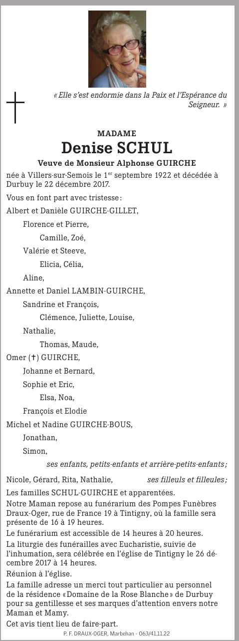 Décédée à Durbuy (6940) le vendredi 22 décembre 2017 à l'âge de 95 ans