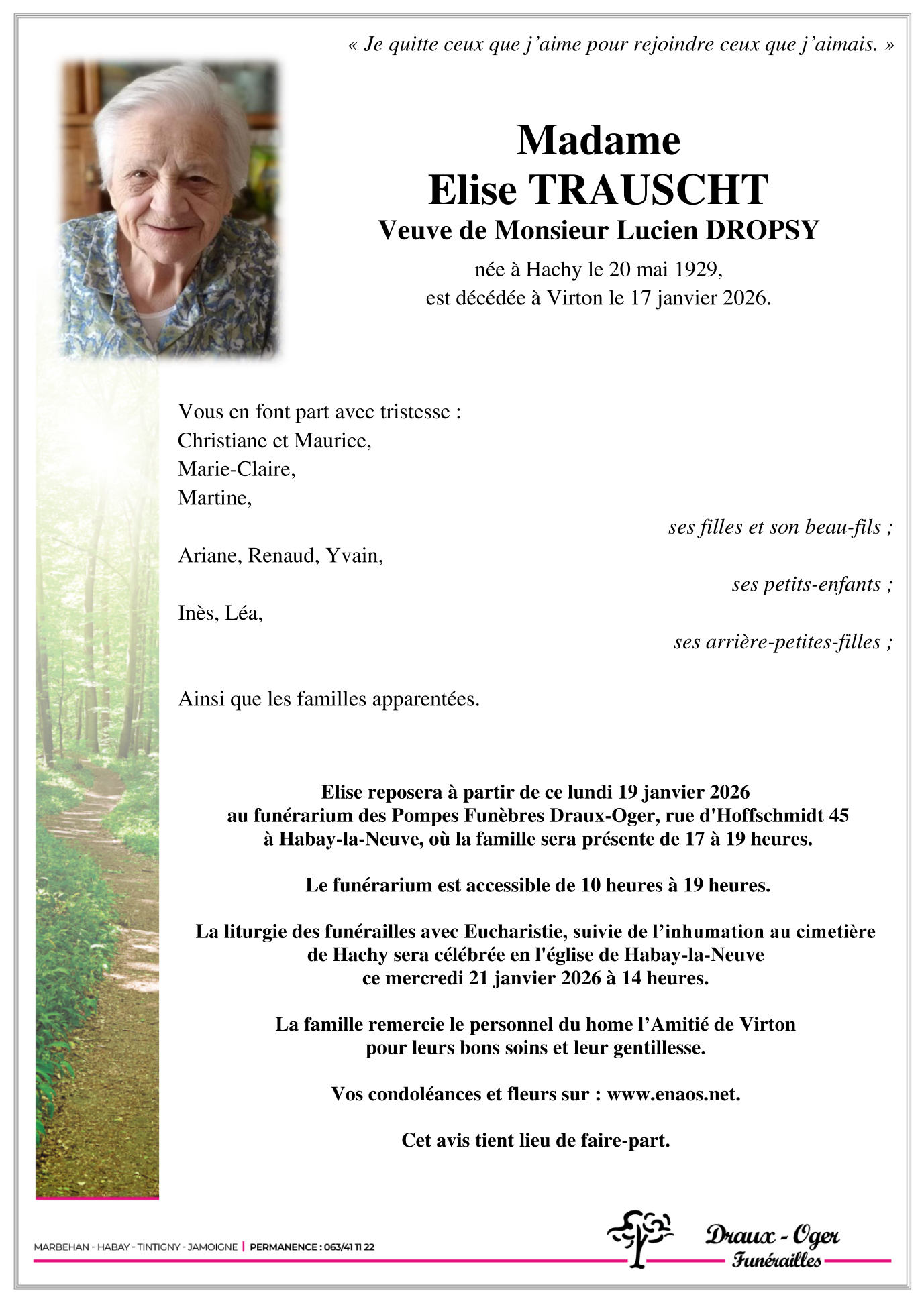 Décédée à Virton (6760) le samedi 17 janvier 2026 à l'âge de 96 ans