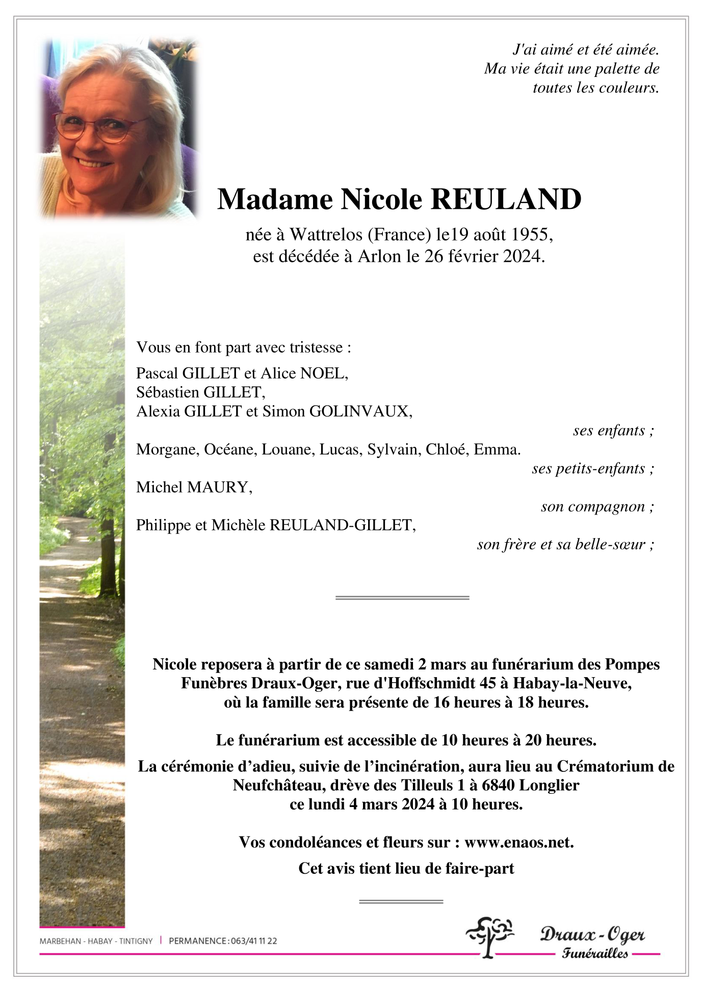 Décédée à Arlon (6700) le lundi 26 février 2024 à l'âge de 68 ans