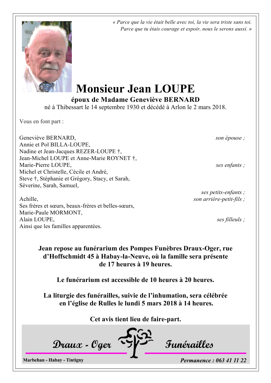 Décédé à Arlon (6700) le vendredi 2 mars 2018 à l'âge de 87 ans