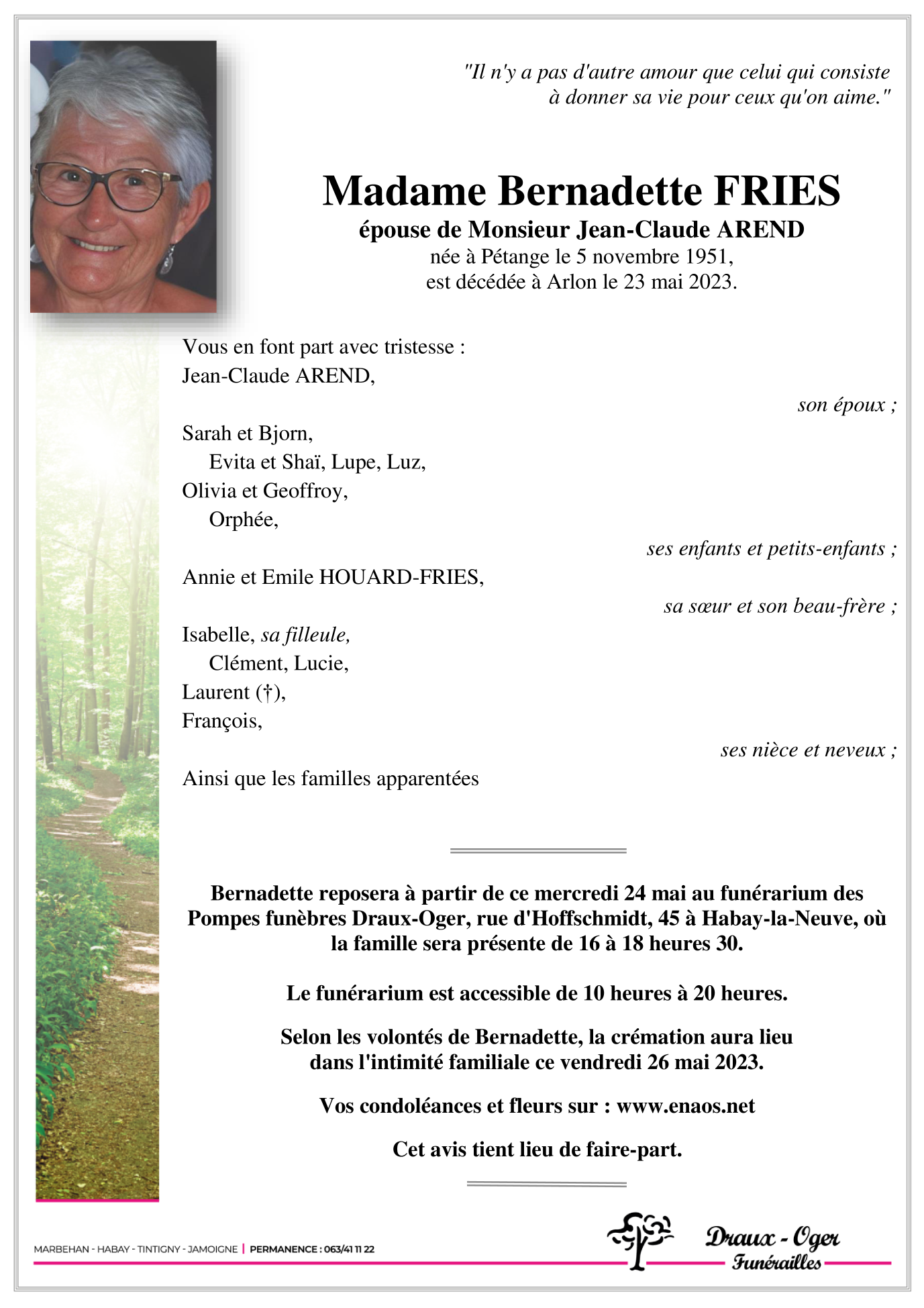 Décédée à Arlon (6700) le mardi 23 mai 2023 à l'âge de 71 ans