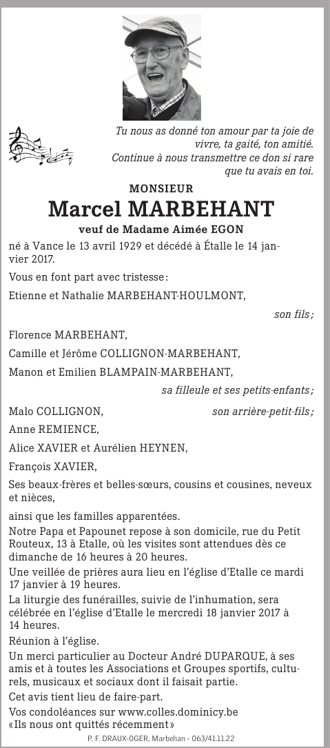 Décédé à Etalle (6740) le samedi 14 janvier 2017 à l'âge de 87 ans
