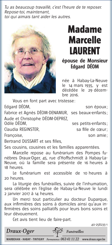Décédée à Habay-la-Neuve (6720) le jeudi 29 décembre 2016 à l'âge de 81 ans