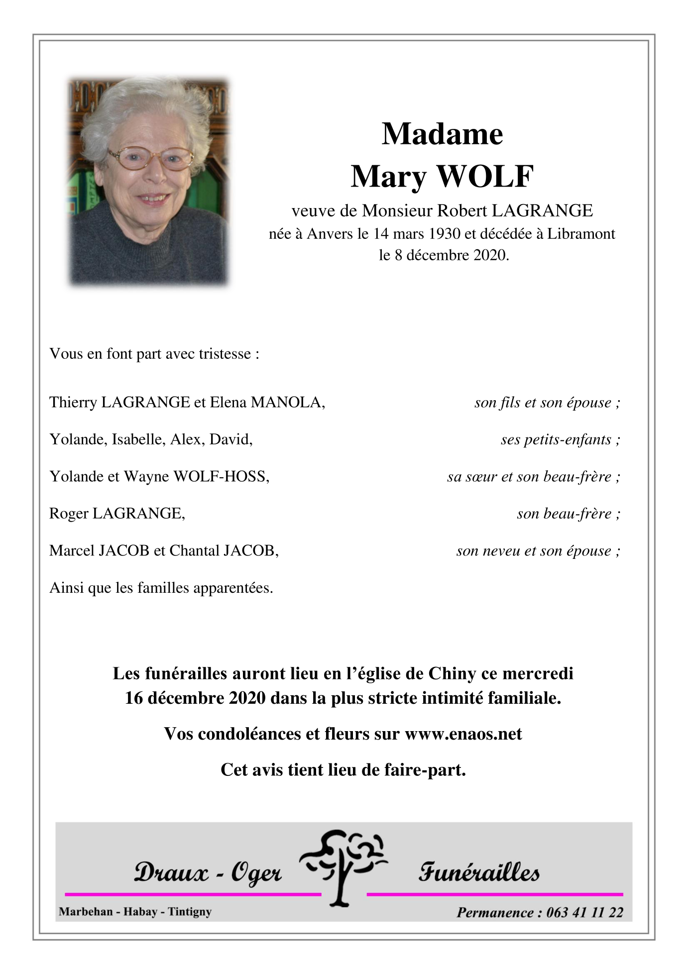Décédée à Libramont-Chevigny (6800) le mardi 8 décembre 2020 à l'âge de 90 ans