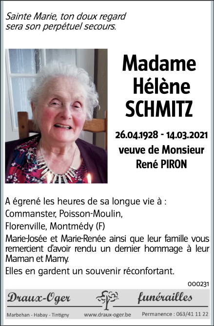 Décédée à Verdun (55100, France) le dimanche 14 mars 2021 à l'âge de 92 ans