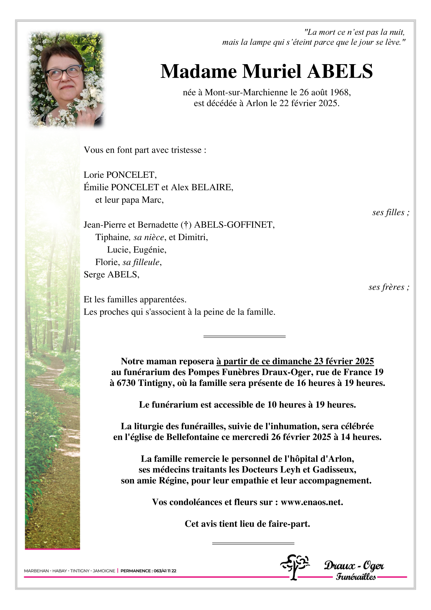 Décédée à Arlon (6700) le samedi 22 février 2025 à l'âge de 56 ans