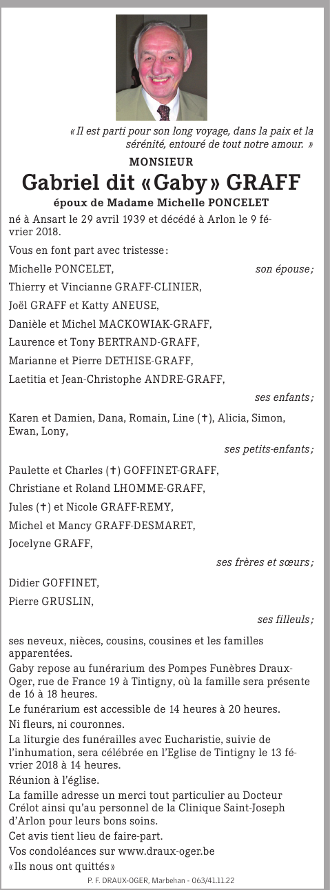 Décédé à Arlon (6700) le vendredi 9 février 2018 à l'âge de 78 ans