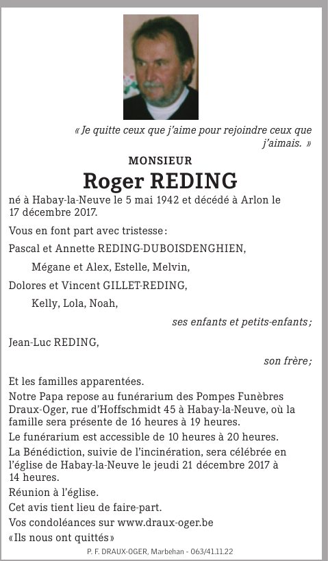 Décédé à Arlon (6700) le dimanche 17 décembre 2017 à l'âge de 75 ans