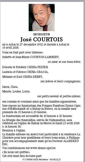Décédé à Arlon (6700) le jeudi 19 avril 2018 à l'âge de 65 ans