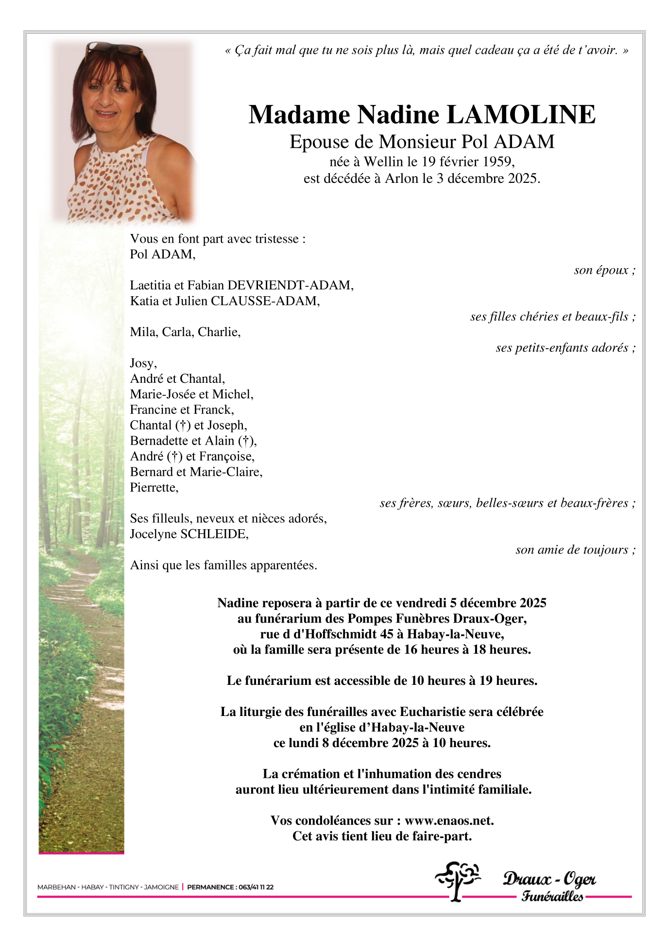 Décédée à Arlon (6700) le mercredi 3 décembre 2025 à l'âge de 66 ans