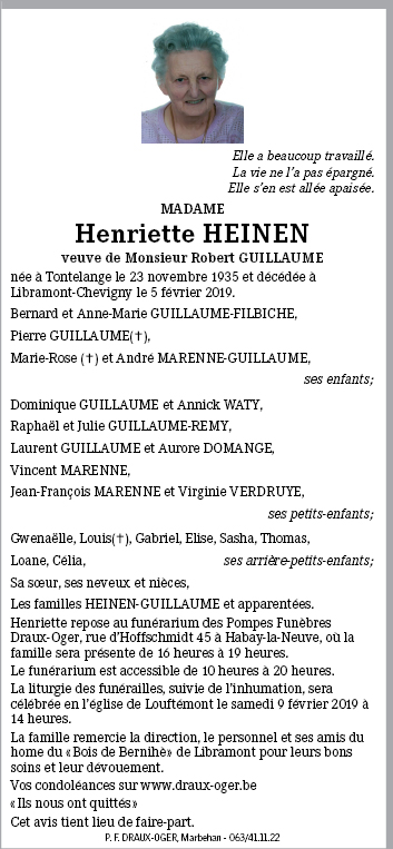 Décédée à Libramont-Chevigny (6800) le mardi 5 février 2019 à l'âge de 83 ans